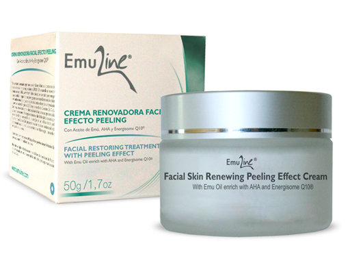 The EmuLine® Facial Restoration Cream with Peeling Effect has been especially developed to fight the constant onslaughts to which the skin is exposed, be these environmental or hormonal factors or due to daily stress, all of which deteriorate and age skin tissue. Its Emu Oil formula provides large quantities of natural antioxidants that prevent premature aging of the skin. Its high level of monounsaturated and polyunsaturated fatty acids, mainly Oleic and Linoleic Acids allow it to penetrate deep down into the layers of the skin quickly and easily, applying a deep emollient and moisturizing action. It regenerates tissues, increasing the skin cell growth activity. It prevents and eliminates wrinkles and blotching of the skin. It does not cause acne. The Alfahydroxiacids (AHA) contained in its formula are well known for increasing cell restoration via the peeling effect, delivering smoothness and a youthful appearance to the skin. The Q10® Energisome helps detoxify and defend skin tissue from the continuous onslaughts it is subject to, protecting cell structure from damage caused by free radicals, thus improving the energy of the cells, and promoting the restoration and regeneration of the skin.